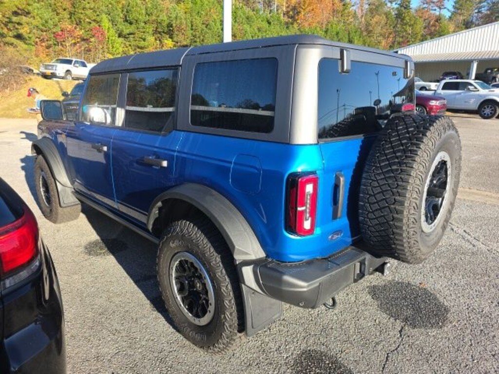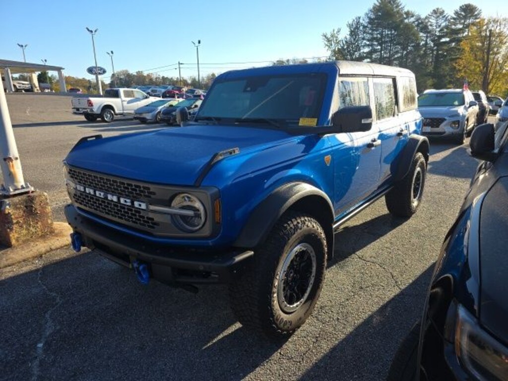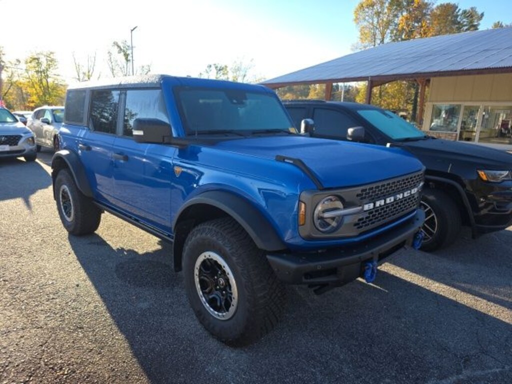 Check out all these great options Bronco Badlands, 4D Sport Utility, 2.7L EcoBoost V6, 4WD, Black Onyx Leather, 4-Wheel Disc Brakes, 6 Speakers, ABS brakes, Air Conditioning, AM/FM radio: SiriusXM with 360L, AM/FM Stereo, Auto High-beam Headlights, Brake assist, Carbonized Gray Molded-In-Color Hard Top, Compass, Delay-off headlights, Driver door bin, Driver vanity mirror, Dual front impact airbags, Dual front side impact airbags, Electronic Stability Control, Emergency communication system: 911 Assist, Exterior Parking Camera Rear, Ford Performance Heavy-Duty Modular Front Bumper, Front & Rear Floor Liners, Front anti-roll bar, Front Bucket Seats, Front Center Armrest, Front License Plate Bracket, Front reading lights, Front Row Top Panels & Door Storage Bags, Front Row Top Panels Storage Bag, Front wheel independent suspension, Fully automatic headlights, Heated door mirrors, Illuminated entry, Integrated roll-over protection, Low tire pressure warning, Occupant sensing airbag, Outside temperature display, Overhead airbag, Overhead console, Panic alarm, Passenger door bin, Passenger vanity mirror, Power door mirrors, Power steering, Power windows, Radio data system, Rear-Window Defroster & Washer, Remote keyless entry, Security system, SiriusXM Radio w/360L, Speed control, Split folding rear seat, Steering wheel mounted audio controls, SYNC 4, Tachometer, Telescoping steering wheel, Tilt steering wheel, Traction control, Trip computer, Variably intermittent wipers, and Wheels: 17" Black High Gloss-Painted Aluminum. Blue Metallic 4WD 10-Speed Automatic 2.7L EcoBoost V6